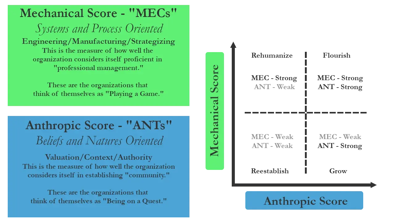 Based on the Organizational Assessment survey results for your organization, we will plot your organization within the four-box matrix as labeled and characterized below. The goal is obviously to find an organization positioned in the upper-right quadrant, with high scores on both the Mechanical and Anthropic spectrums. To be in that quadrant is to operate as a “community”- well-ordered, relationally coherent, and with a common creed. It is to simultaneously